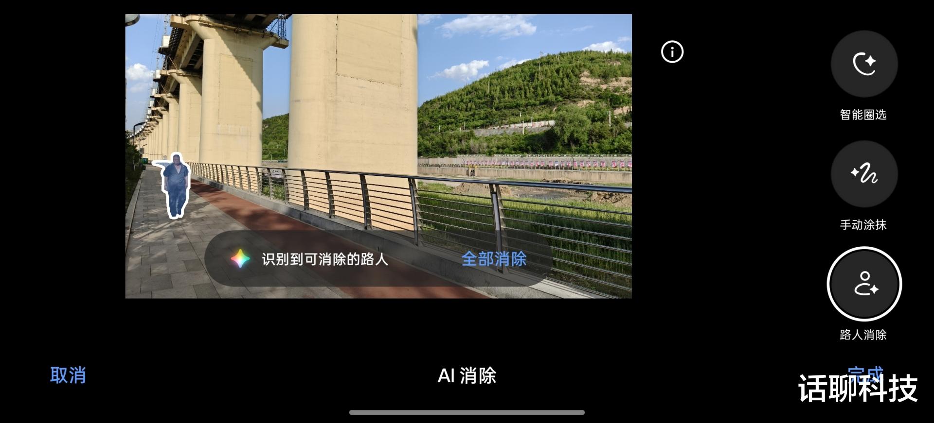 再者就是AI消除功能,这点对于喜欢旅拍、街拍、没事就自拍的用户都很实用,人多场合没法完全能避免路人入镜,也不用苦苦等待最佳时机,直接拍摄,后期用AI消除处理就好,支持智能圈选、手动涂抹、路人消除三种设置。