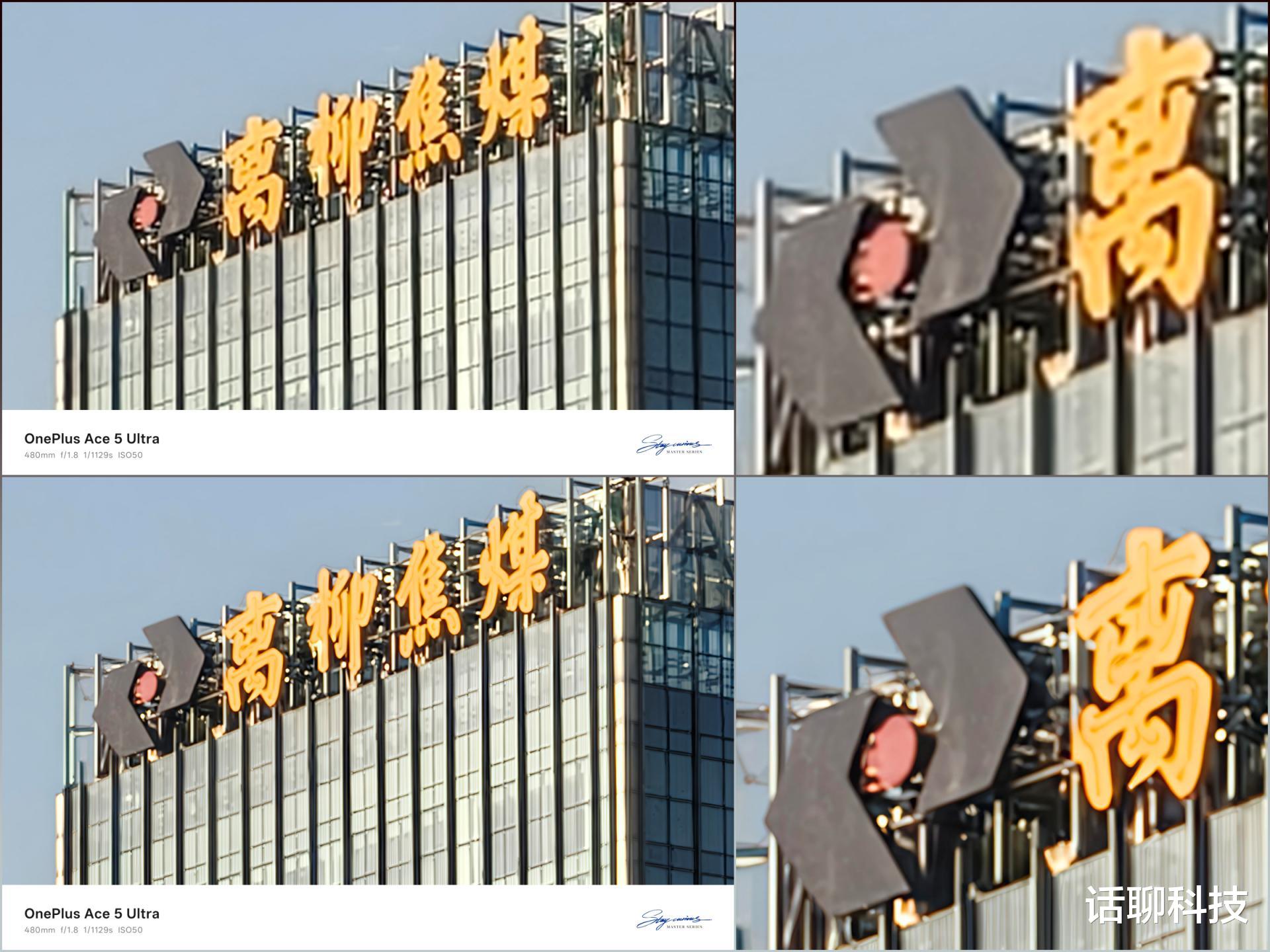 先来说,AI超清像素这个功能相当于给手机增加了一个光学长焦。正常在480mm焦距(相当于20倍放大)抓拍的远处大楼的牌匾,原图会显得很模糊。但用AI超清像素修复优化后,也能获得相对高清的体验,就像是用了20倍潜望长焦拍摄一样。