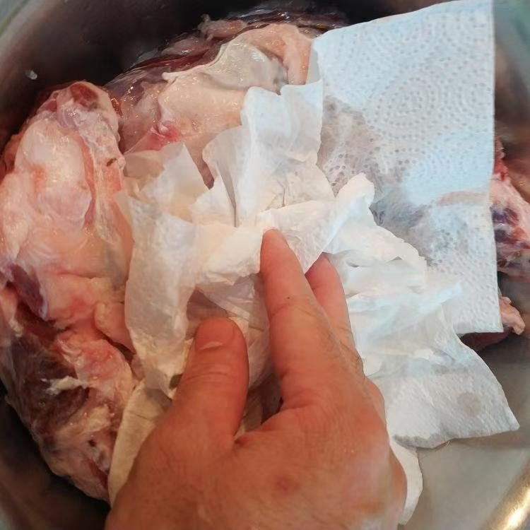 如果对腌制后的牛肉进行了冲洗,就必须使用厨房纸擦干表面水分,尽可能让牛肉表面保持干爽状态。