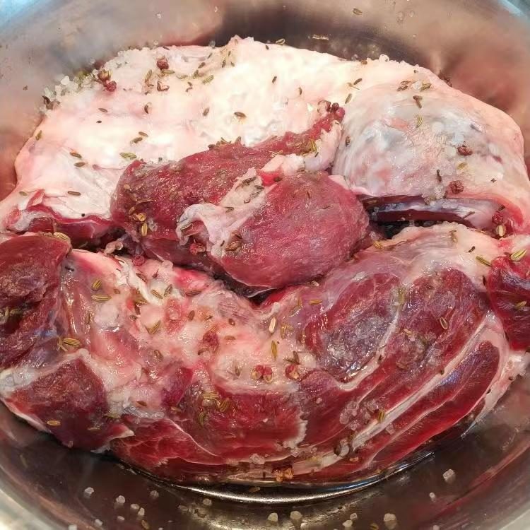 腌制 3 - 4 小时即可,不必刻意延长。虽可将腌制牛肉密封冷藏后再进行下一步,但这样会使腊肉味更明显,新鲜牛肉香味变淡。