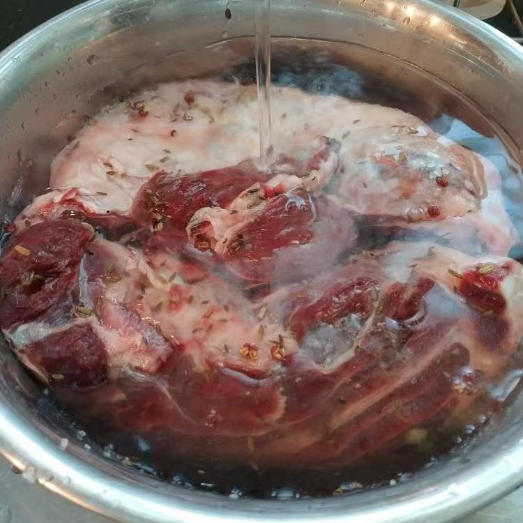 腌制出水结束后,可以用冷水冲洗牛肉表面以去除盐分和脏物。不过,如果经验丰富,也可只用手简单扒拉掉牛肉表面的盐粒,无需冲洗和擦拭。