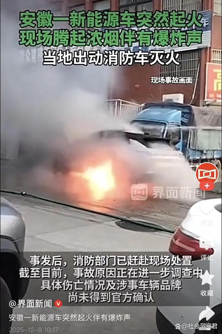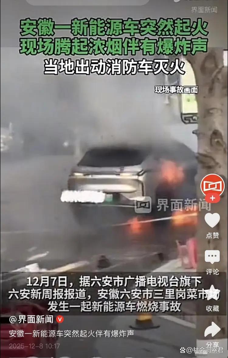 据媒体刚刚报道,12月7日,安徽六安一新能源汽车发生自燃并发出爆炸声音。