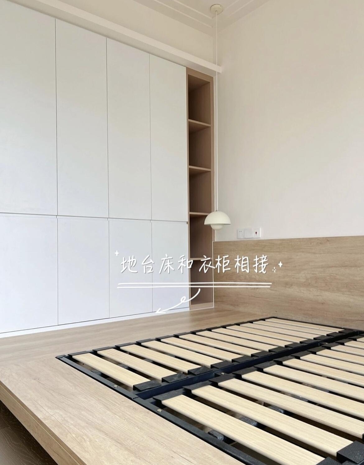 网友@思梦里 家,因为主卧室很小,做完衣柜后只剩2.8米了,放床的话,床两边的过道都会很拥挤,而且也无法放下婴儿床,很难规划未来小朋友睡觉的地方,所以最终选择做地台床。