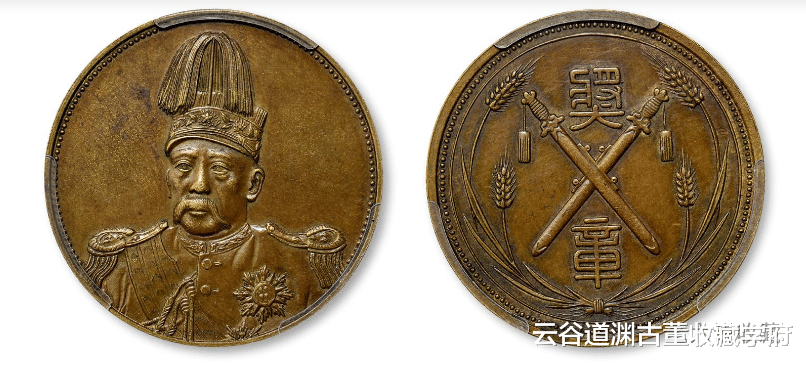 1914年袁世凯戎装像背双剑嘉禾图黄铜质奖章一枚,直径:39毫米,正面袁世凯大面像,坊间一说,袁世凯为奖励1913年助其当选中华民国大总统的有功之臣而特别铸造;