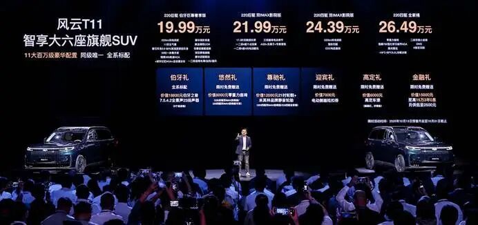 10月13日,以“兑现”为主题的风云T11家庭品鉴日暨预售发布会在安徽芜湖圆满收官。风云T11此次共推出四款版型,预售价19.99万-26.49万元,覆盖不同家庭用户的配置需求。其中,220后驱伯牙巨幕奢享版以19.99万元的起售价,展现出“入门即高配”的诚意;而220四驱全家桶版则以26.49万元的价格,将科技、舒适与性能推向极致。这一价格体系不仅具备市场竞争力,更以“一步到位”的产品逻辑,打破了传统六座SUV在配置与价格之间的取舍困境。