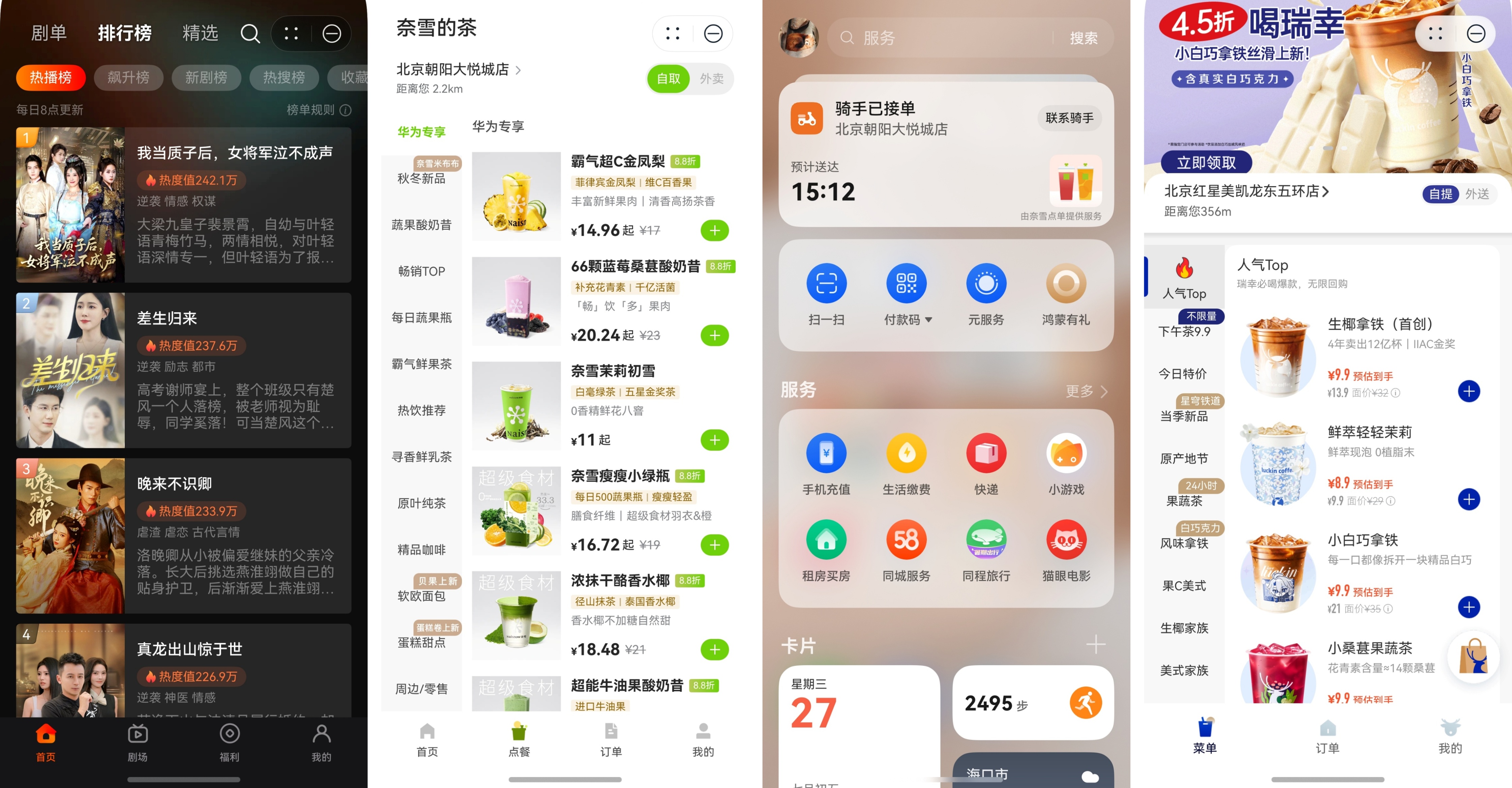 在假期里想通过短剧休闲一下,右滑进入负一屏就能在星芽短剧元服务免费看三集热门短剧,繁花剧场元服务更是有9元专属月卡,让你看海量好剧。奶咖元服务也有华为专享优惠,热门饮品88折,咖啡低至4.5折,追剧时来上一杯,点单后订单状态即刻在负一屏顶端的<服务动态>实时显示,便捷地知晓订单状态。