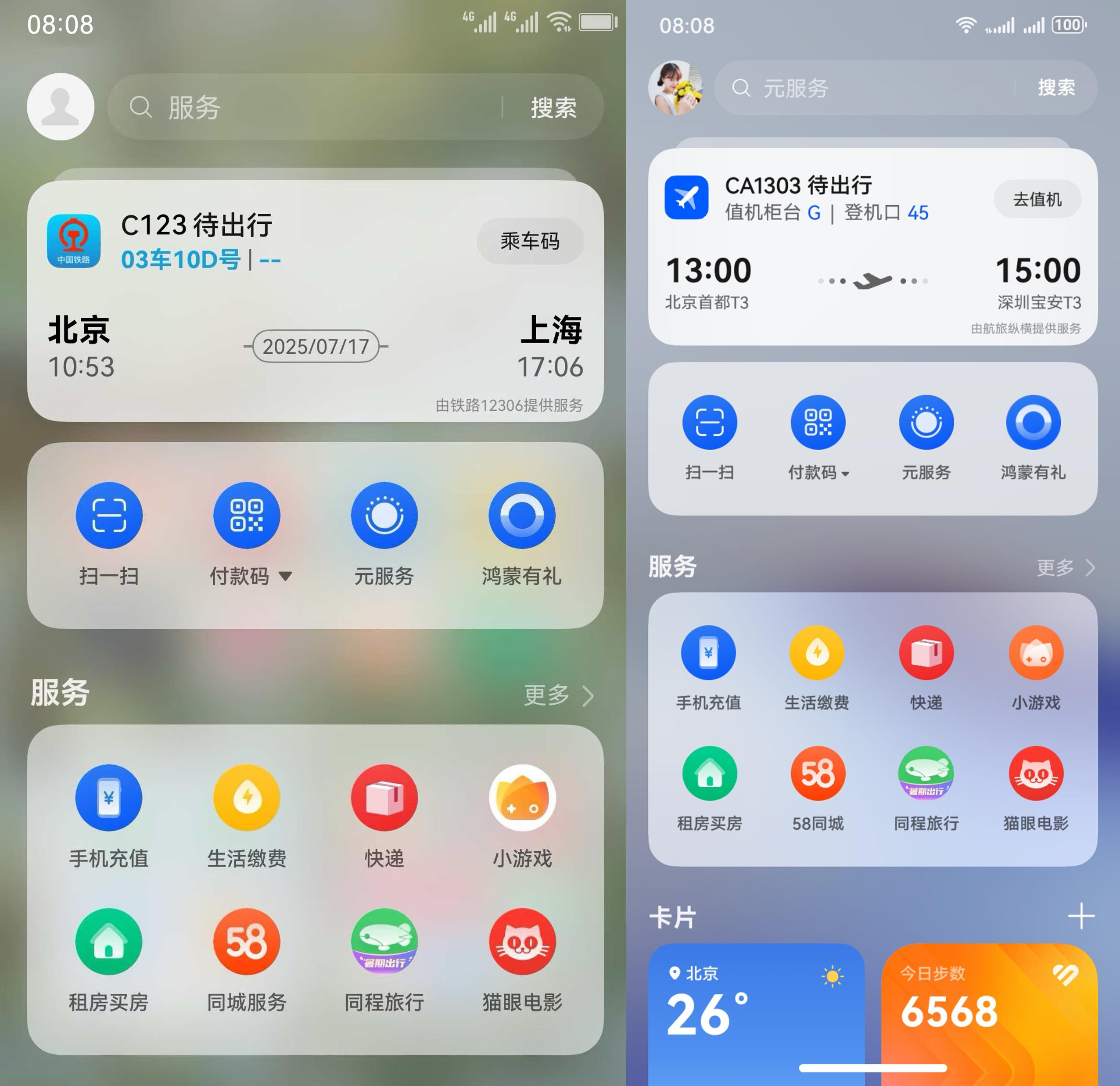 如果国庆要远途旅行,需要乘坐飞机或高铁火车,鸿蒙5的华为负一屏的置顶服务动态提醒可以帮大忙。它可以实时同步航旅纵横和12306的行程信息,按照流程授权关联后,即可在负一屏直接查看车次、发车时间、检票口、车厢座位号等重要信息,特殊状况也会实时提示。如果是自驾出游,负一屏的台风卡片可以在特殊天气时进行提醒,让你在驾车途中有所规划。