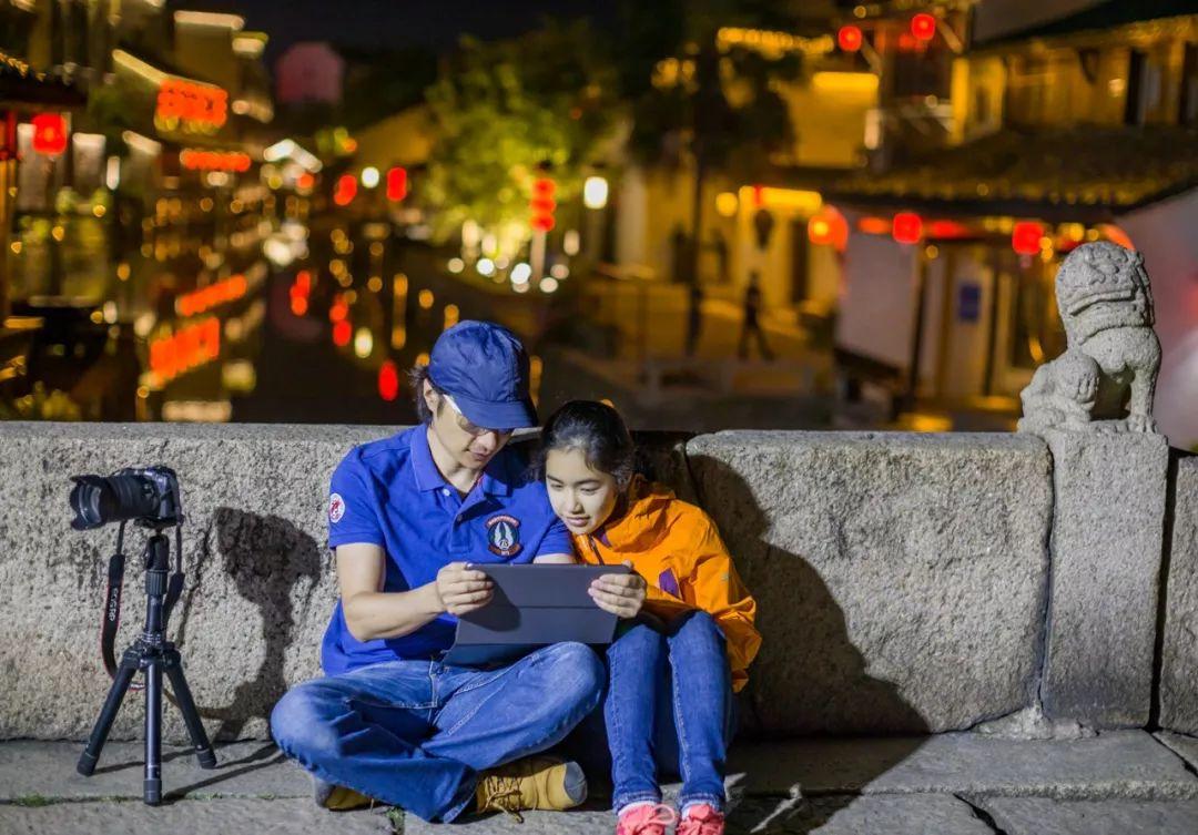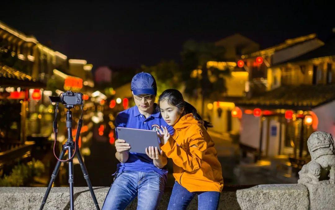 现场给女儿讲解拍摄中的一些实际应用技巧。