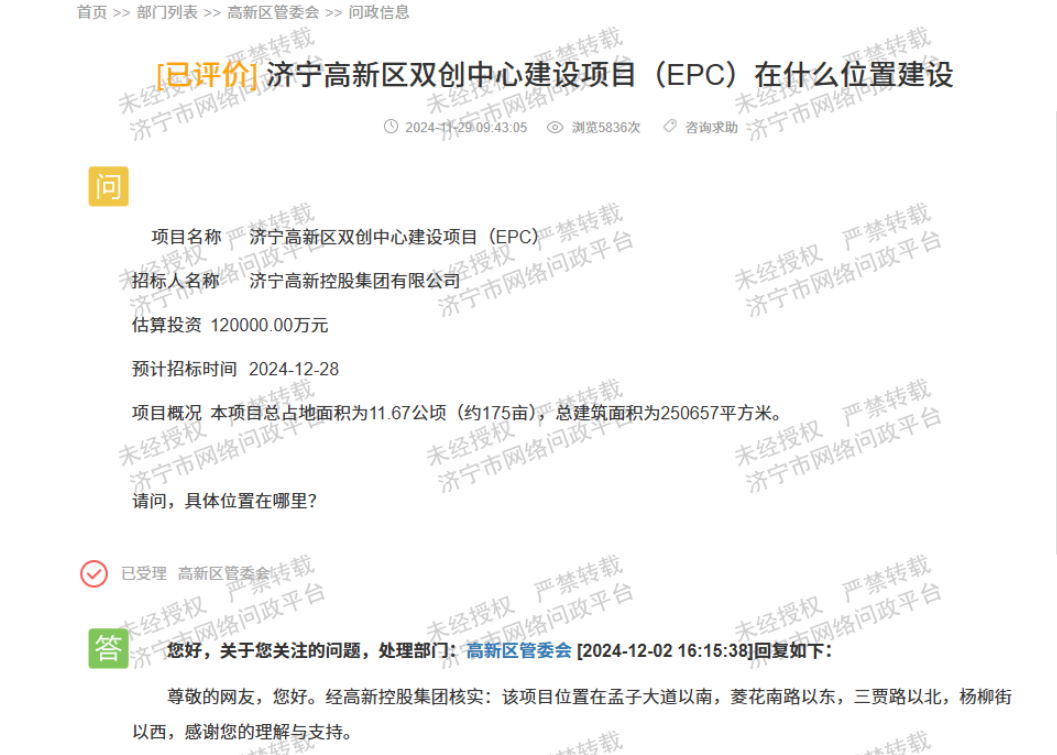 近日,济宁名城事小编从相关渠道获悉,有网友在济宁市网络问政平台询问位于三贾北边的双创项目未来使用情况。