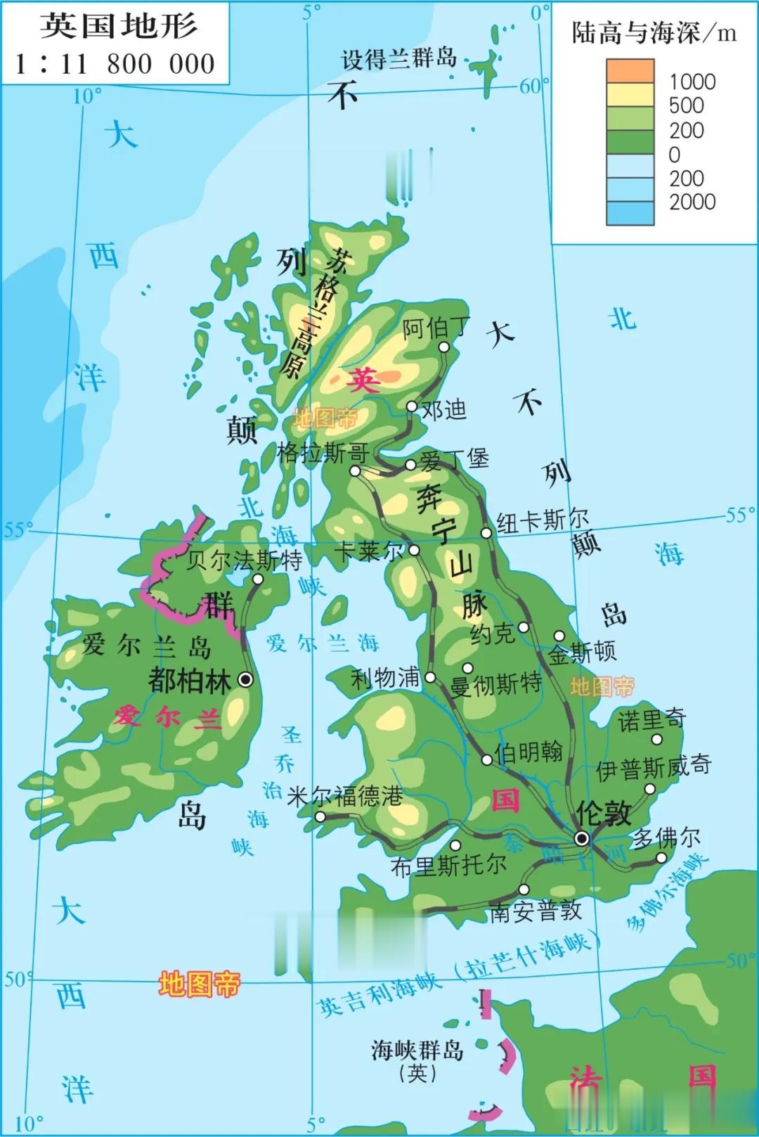 威尔士多山,坎布里亚山又称坎布连山,呈东西走向,平均海拔400-500米。北段多火成岩,有过冰川作用,故地势崎岖,多山峰,最高峰斯诺登山,海拔1085米。