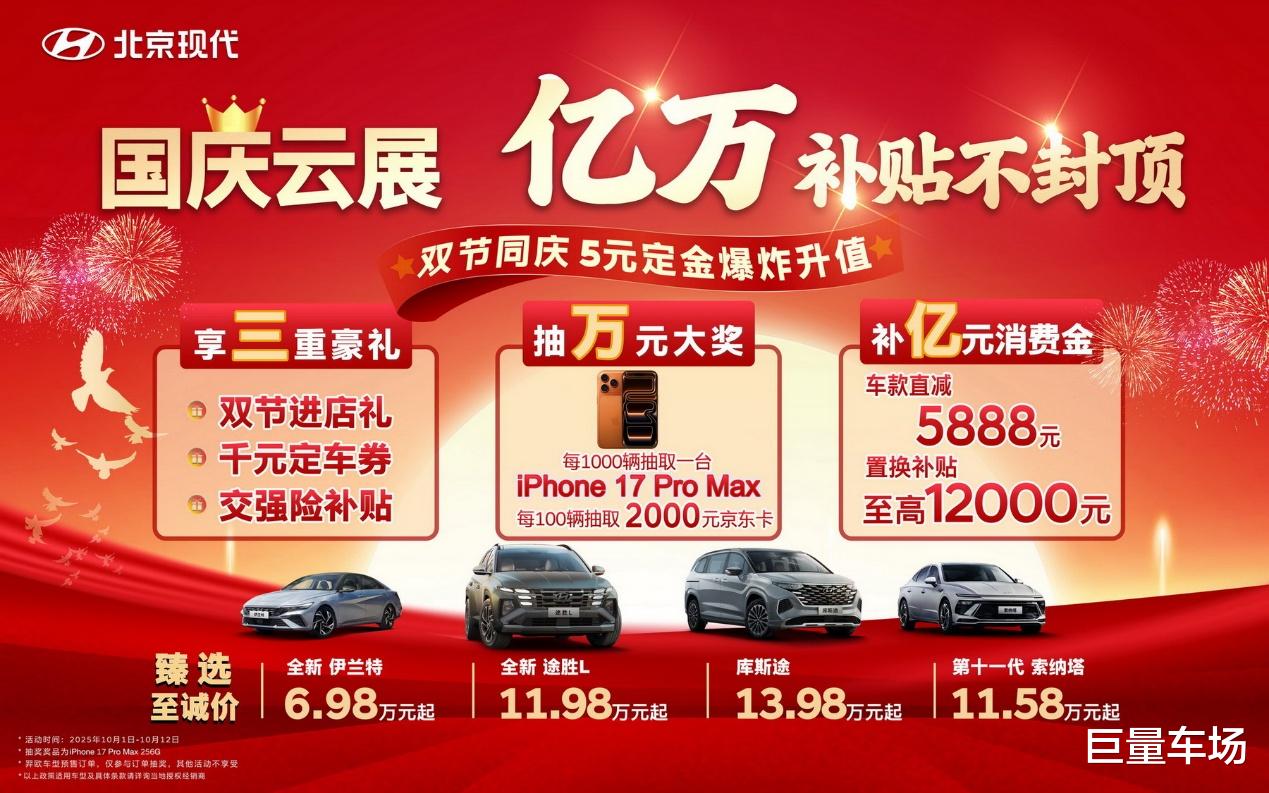 从全新途胜L以技术赋能打造SUV价值标杆,到库斯途、全新伊兰特、第十一代索纳塔精准覆盖家庭、年轻、商务等细分场景,北京现代此次国庆云展,可以说是“立足合资品质、坚守用户价值” 品牌定位的深度落地。此次活动覆盖全系车型,消费者无需担心“心仪车型不参与”。对比年底可能出现的“促销传闻”,北京现代此次活动的优势在于“确定性”——优惠幅度明确、权益兑现及时、抽奖规则透明,不用赌“年底是否真的更便宜”,也不用承担库存车风险。这不是简单的 “降价促销”,而是用“政策确定性”消除用户决策焦虑,也真正的体现了品牌的诚意。