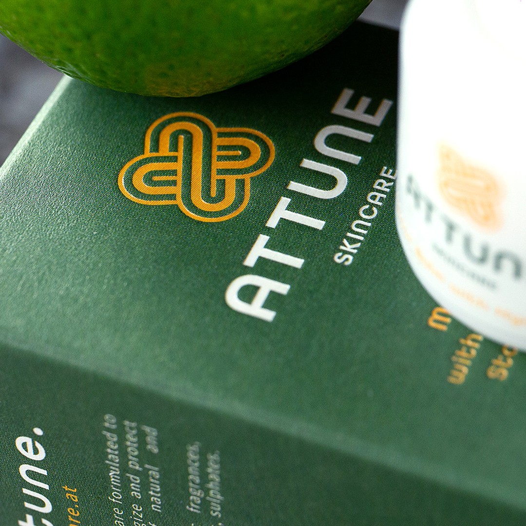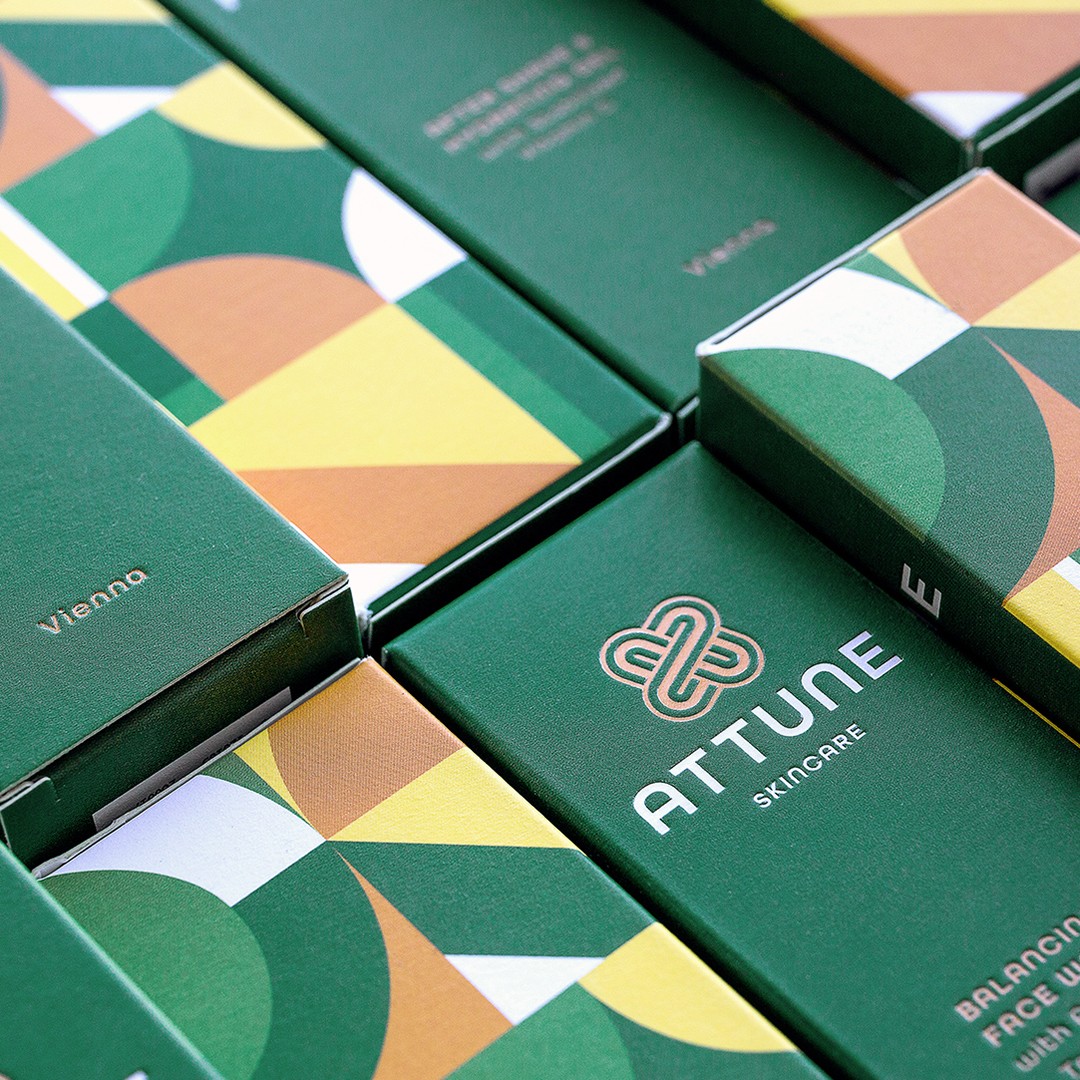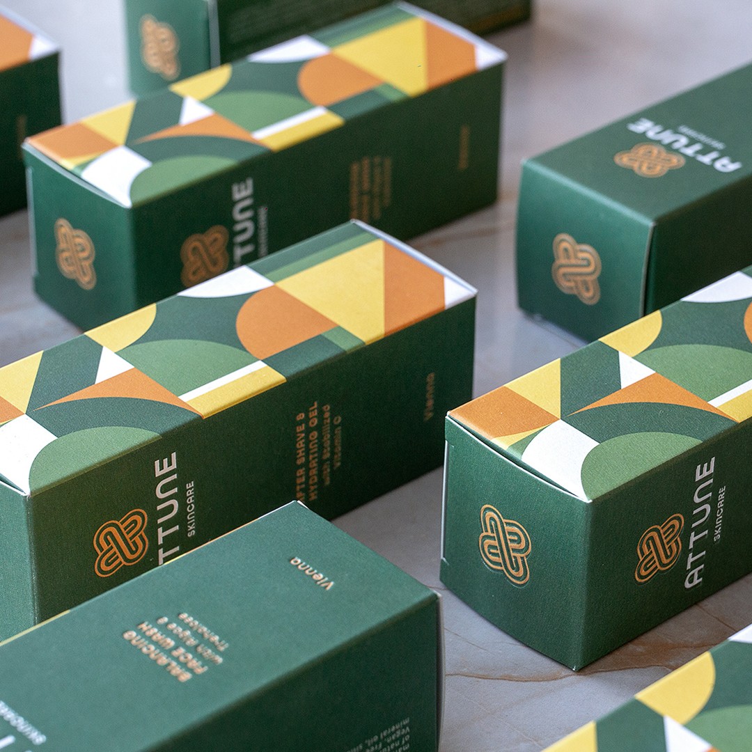 ATTUNE的外盒以深绿色为主色调,沉稳且具自然感,盒身装饰有黄绿、橙等色彩的几何图形,凸显艺术感与活力,不同角度摆放时,几何图案组合变化,视觉效果丰富。图标带有精美的缠绕感,与名称“ATTUNE”字样搭配,既显专业又具独特美学。