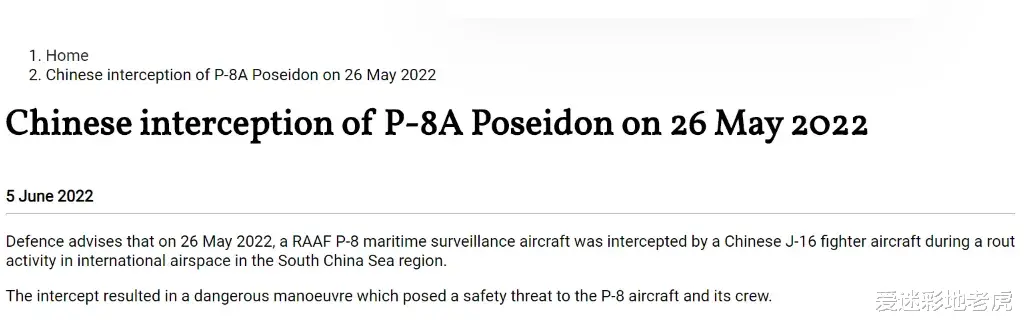 2022年6月5日,澳大利亚国防部在其官网发布声明称,在当年5月26日,一架澳大利亚空军的P-8A侦察机在南海国际空域遭到了中国歼-16战机的拦截,这次拦截是一次非常危险的行为,直接威胁到了P-8A飞机及其机组成员的安全。澳国防部还称,澳大利亚政府已向中国政府表达了对这一事件的担忧,数十年来,澳大利亚一直都在南海国际空域开展海上监视活动,澳军机在此有飞行自由。