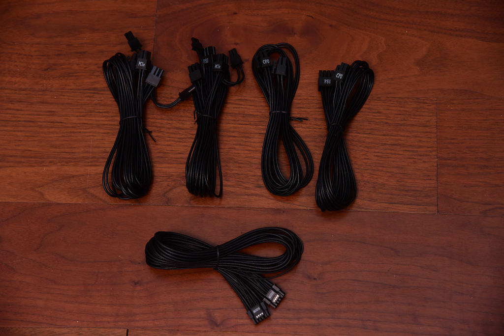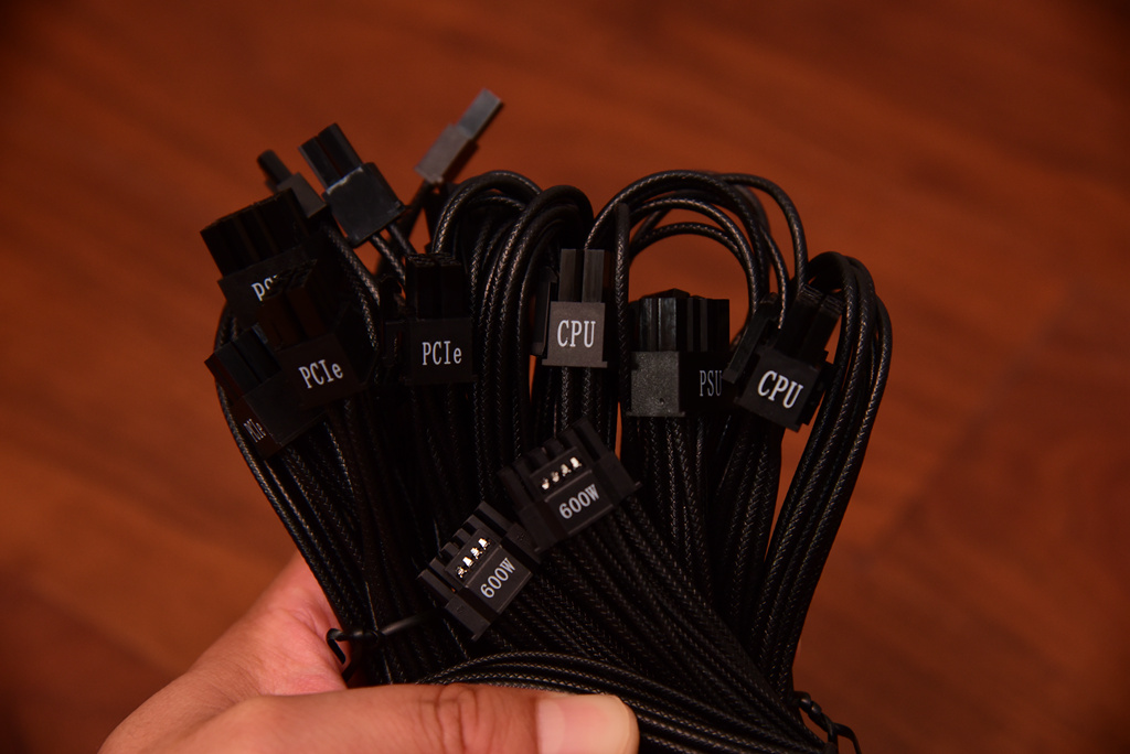 附件中除了电源连接线,附带了9条模组线,线材数量非常充足,黑色的模组线材质是软硅胶,可以让走线更美观。