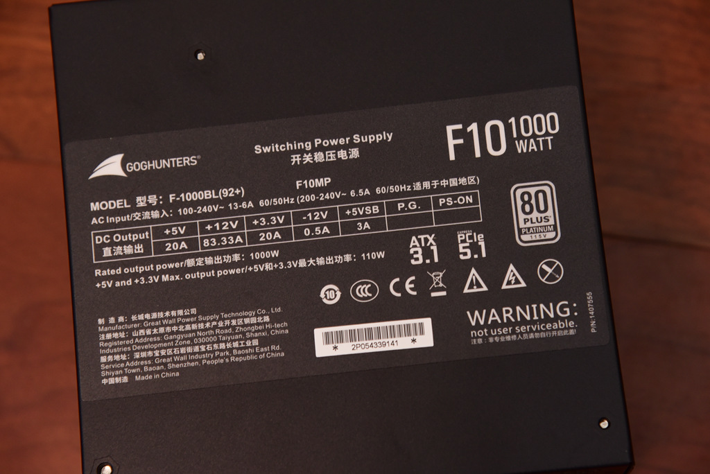 选用了长城F10白金牌全模组电源,型号为F10,属于猎金系列黑色款产品,额定功率为1000W,通过CCC认证,电源最高转换效率为92.41%,满足80PLUS白金标准,ATX3.1标准,支持PCIE5.1输出,支持10年质保。