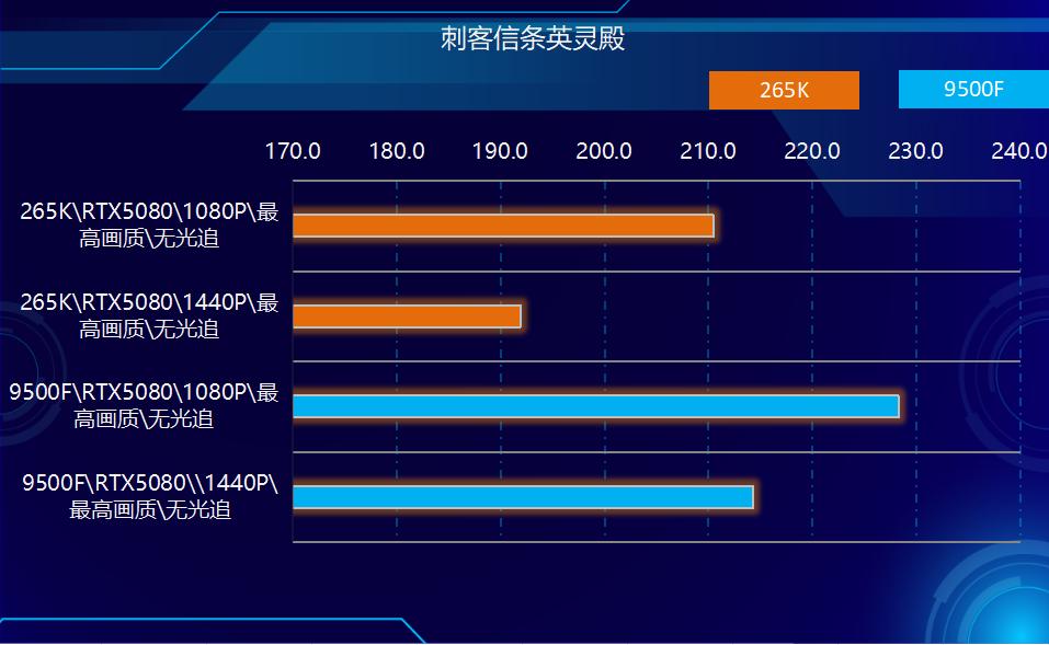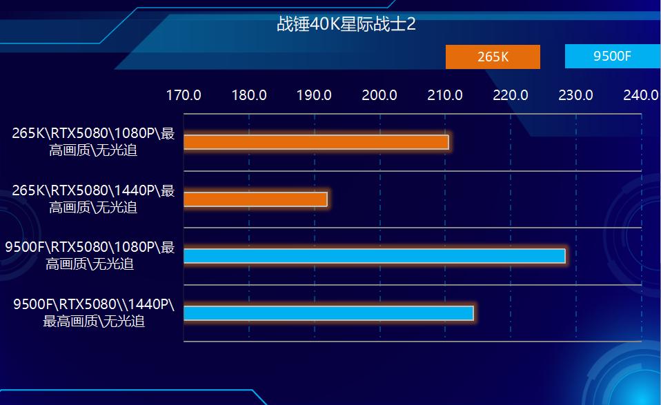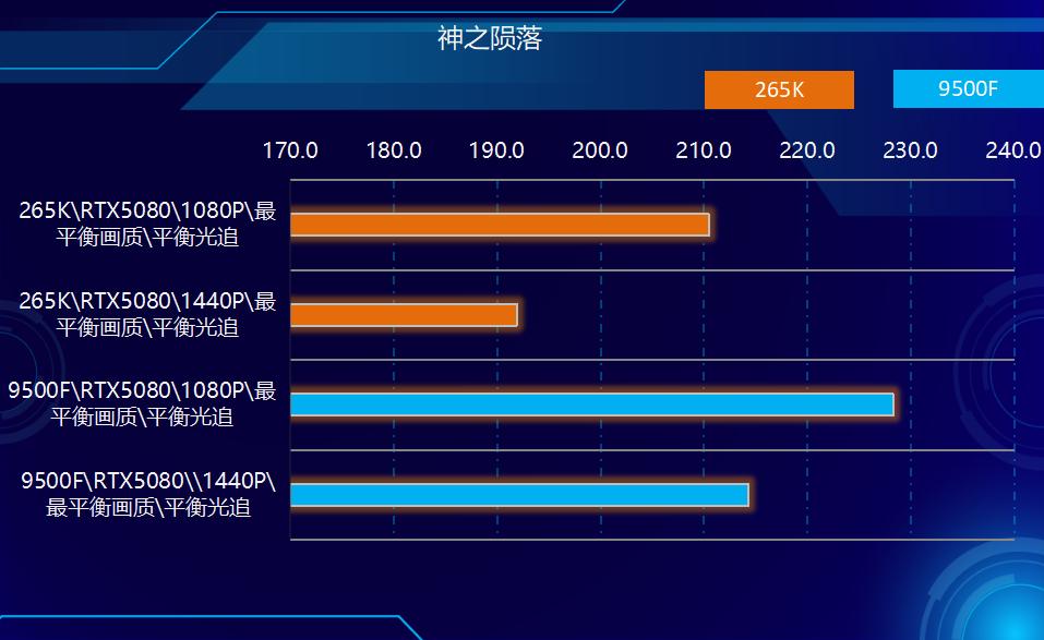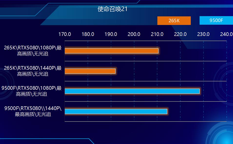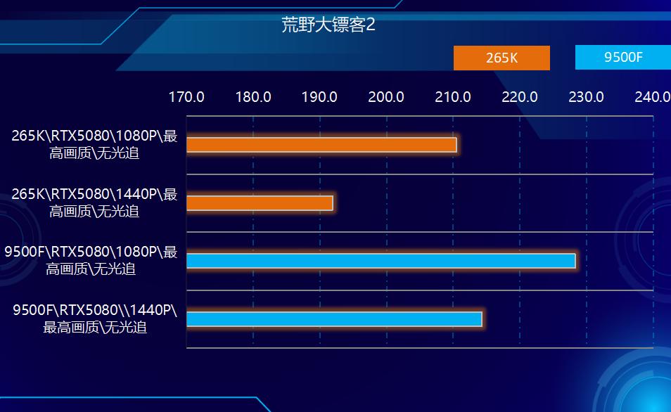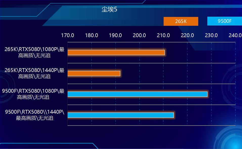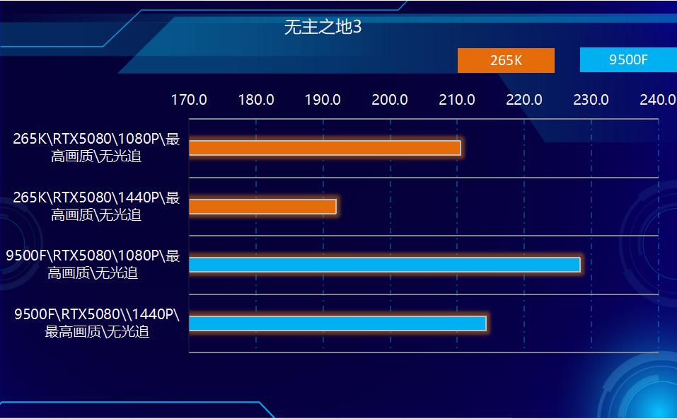 2、游戏方面,在测试的所有游戏中,9500F都实现了对265K的超越。在非光追游戏中,9500领先265K幅度在3%-10%之间,平均领先大约7%左右,在光追部分游戏中,领先幅度在2%-7%之间,综合所有游戏测试结果性能领先幅度在6%左右。