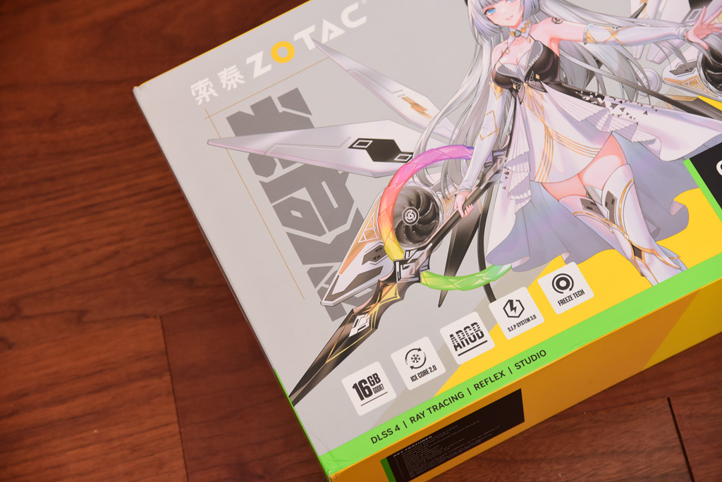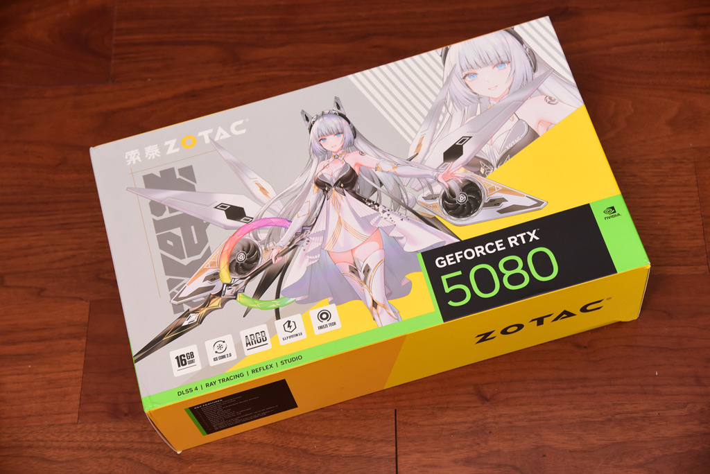 测试采用了索泰的ZOTAC RTX5080 16G 天启OC版本,显卡包装以二次元风格为设计基调,天启姬是产品的代言人。