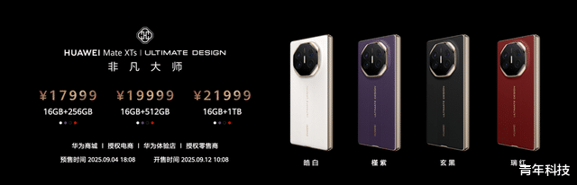 华为Mate XTs 非凡大师于9月4日18:08正式预售,9月12日10:08开售,建议零售价17999元起。购买华为Mate XTs 非凡大师,尊享多重免费服务,包括低至五折的超值屏幕惠换服务、一年内两次免上门服务费、两年内四次免费贴膜,以及到店VIP专属服务。同时,随新机选购华为Care+服务,更能为您的折叠屏幕提供周全保障,尽享安心无忧的使用体验。
