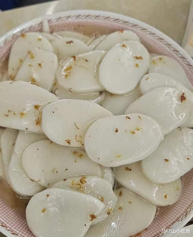 桂花年糕:年糕切片,搭配当季的桂花糖汁,清爽解油腻,年糕吃起来QQ弹弹,软糯美味,是很多人必点的解辣神器。