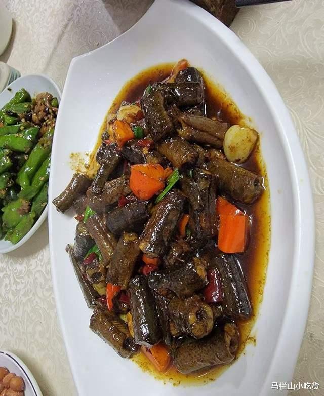红烧鳝鱼:鳝鱼切段,直接过大油爆,搭配一点辣椒和大蒜子,吃起来鳝鱼滑嫩,肉质细嫩,中等的辣度,很下饭。