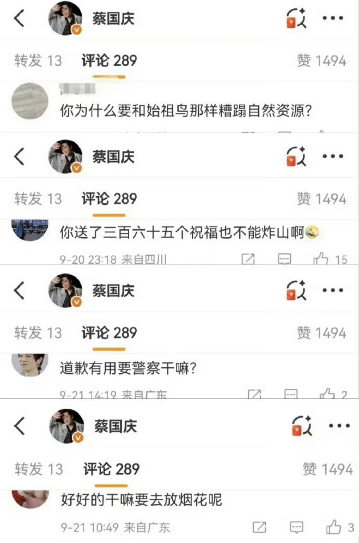 随着舆论热度攀升,“蔡国强”三个字却在传播中上演魔幻变形记。大量“认字认半边”的网友将“国强”看作“国庆”,如潮水般涌入歌手蔡国庆的微博、抖音评论区质问道:“《365个祝福》难道改成《365个污染》了?”“快60岁的人怎么还放山火玩行为艺术?”更有“时空警察”翻出他的代表作歌词灵魂改编:“你祝福了大江南北,怎么转头就炸喜马拉雅?”