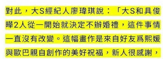 不过,大S对外表示,她一开始就不打算办婚礼。