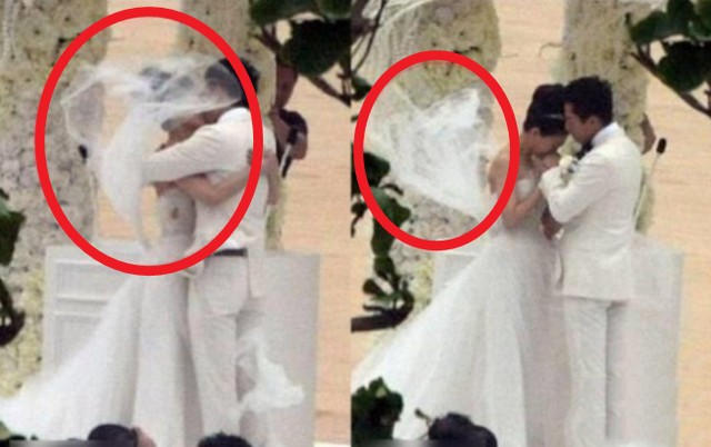 大S的婚纱被吹的随风飘扬,头纱更是甩到了汪小菲的脸上。
