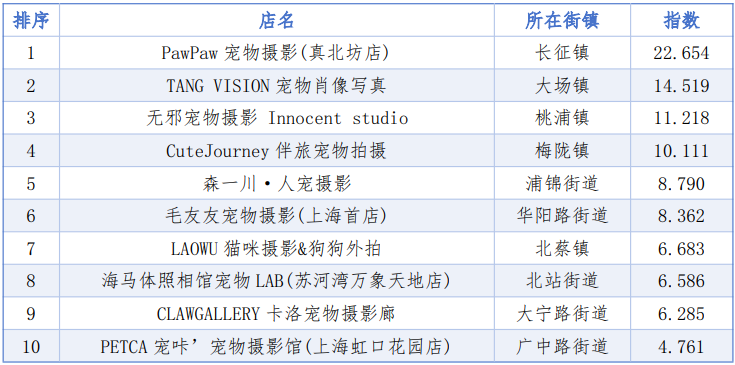 以相关平台的公开数据为基础,按照每家人均消费量占TOP10人均消费总量的比例,形成宠物摄影人均消费排名指数: