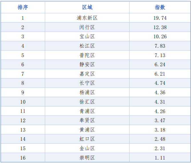 将各区线下宠物消费业态数量占全市总量的比例,折算出数量排名指数:
