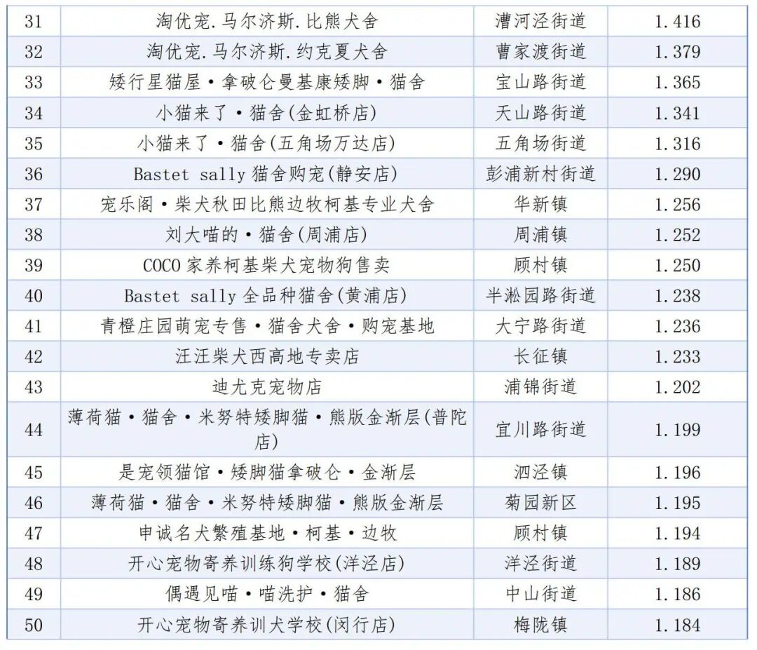 以相关平台公开数据为基础,依照宠物店数量、参与评价店比例和相同比例评价分高低的顺序,进行数据综合处理,形成社会对区、镇和街道宠物店服务质量的平均评价排名。