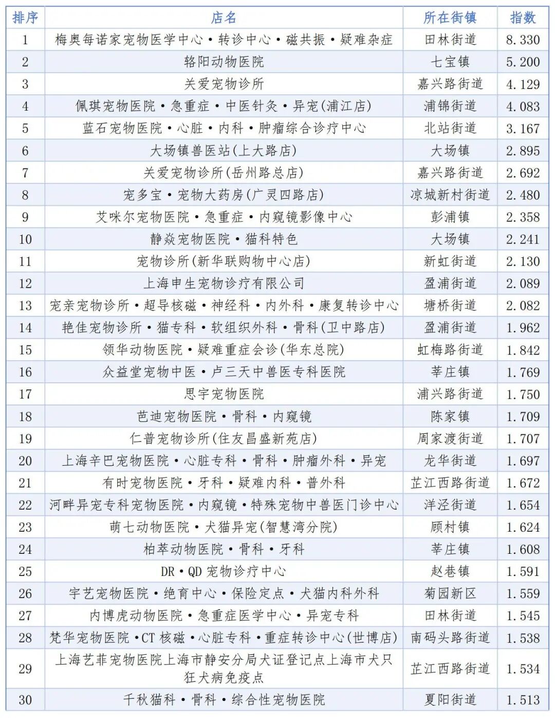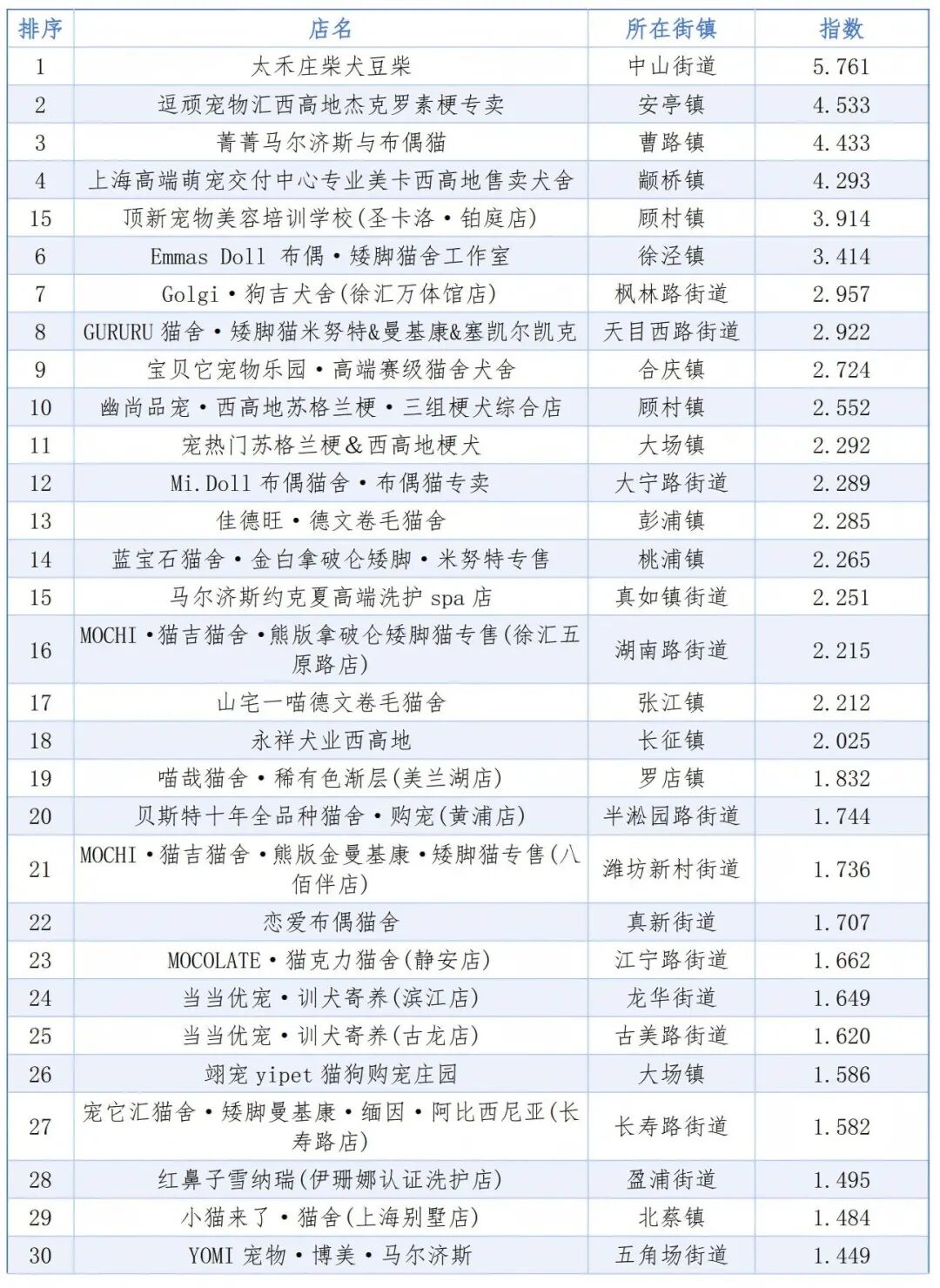 各种线下宠物消费业态在108个街道共有1870家,按照各街道数量占街道总量的比重,折算出街道数量排名指数,得分相同的并列排名。
