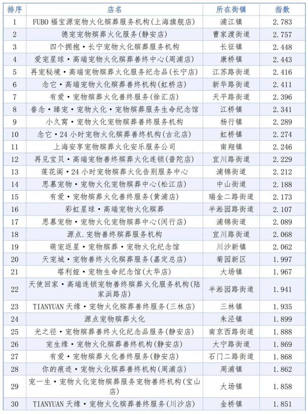 以相关平台的公开数据为基础,按照每家人均消费量占TOP30人均消费总量的比例,形成宠物殡葬机构人均消费排名指数: