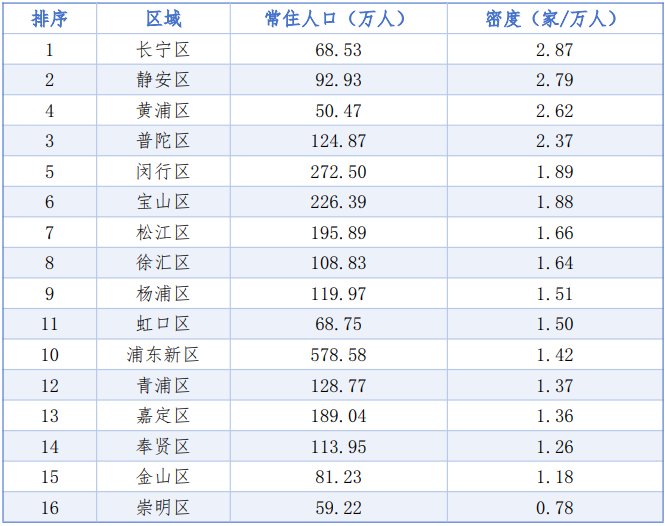 将各区线下宠物消费业态数量除以区域面积,形成地域数量密度排名指数: