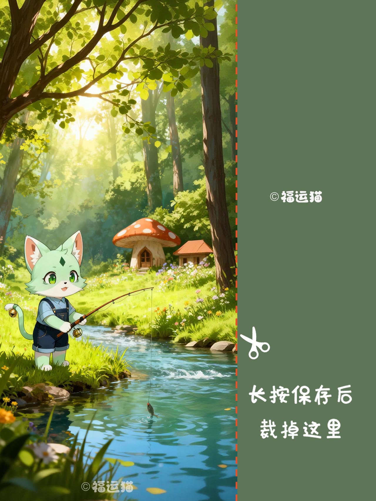 阳光穿过密林洒下光斑,福运猫森泽正站在清浅溪流边钓鱼,鱼竿已钓起一条小鱼,水面漾开细碎波纹。浅蓝衬衫配深蓝背带裤,尾巴铃铛晃出俏皮,绿眼睛满是欢喜。岸边野花绚烂,远处蘑菇小屋藏在林间,满是童话温柔。它把“平安喜乐”的祝福藏进溪风,愿你常伴这般清新美好🌿
