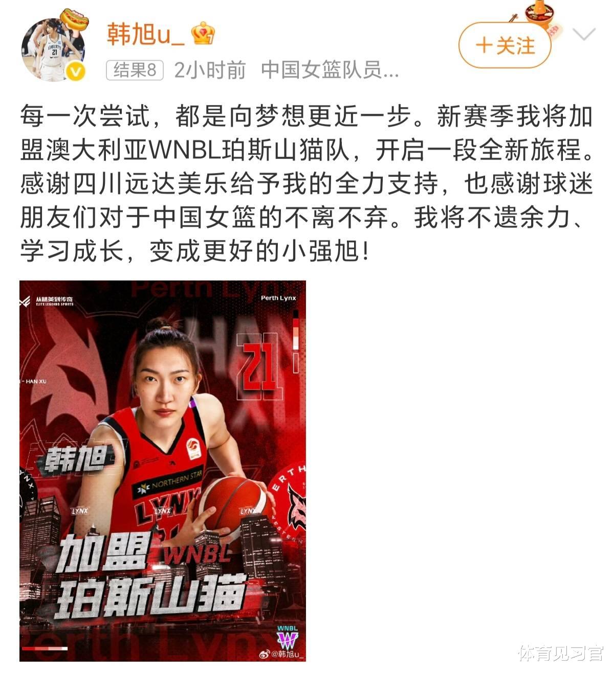2025年10月11日,中国女篮核心韩旭通过个人微博官宣重磅消息:加盟澳大利亚WNBL珀斯山猫队,签约1年。这支球队将于10月19日迎来新赛季首战,对手是阿德莱德,届时韩旭将开启澳洲征程。