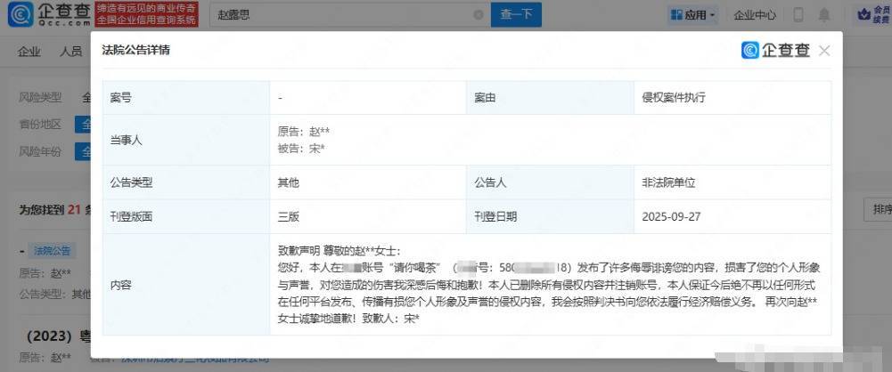 2025年9月28日,北京市法院刊登的一则致歉声明引发广泛关注。被告宋某公开承认长期发布侮辱、诽谤演员赵露思的不实内容,导致其公众形象受损,并承诺履行经济赔偿义务。这场历时近三年的维权战以赵露思的胜诉告终,也再次将娱乐圈网络暴力与艺人权益保护的议题推向台前。