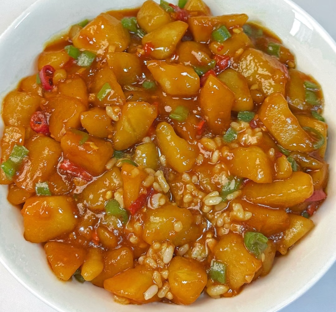 ——答案是:丁丁!5mm 见方的小方块,一口一粒,边缘略带弧度,炒完会像金色骰子,在碗里咕噜噜打滚。关键技巧:切完别泡水!土豆表面那层淀粉就是天然“勾芡粉”,能让酱汁裹得更紧。