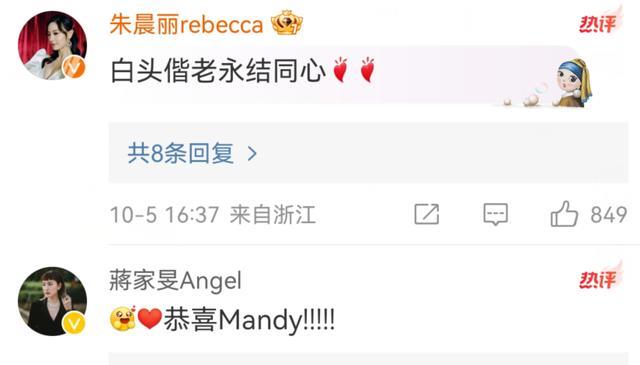 黄智雯官宣后,TVB艺人朱晨丽、蒋家旻等都为她送上祝福。