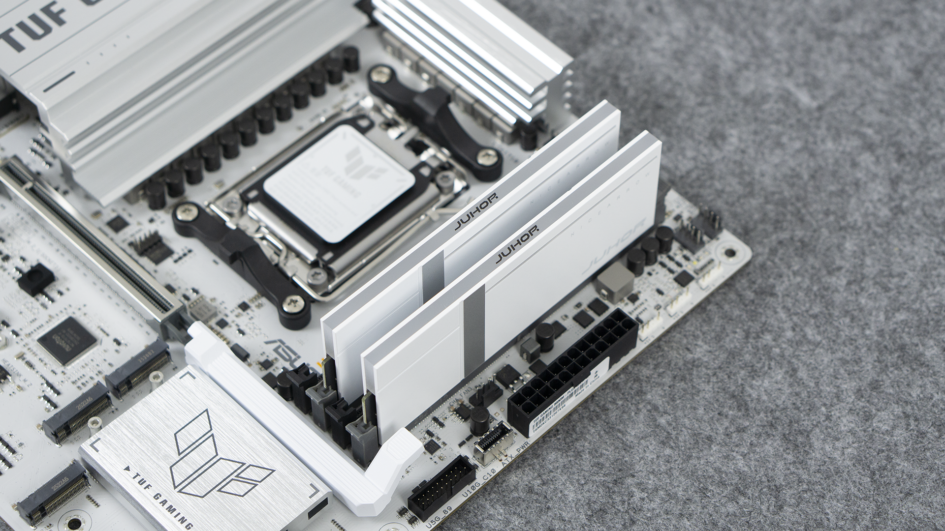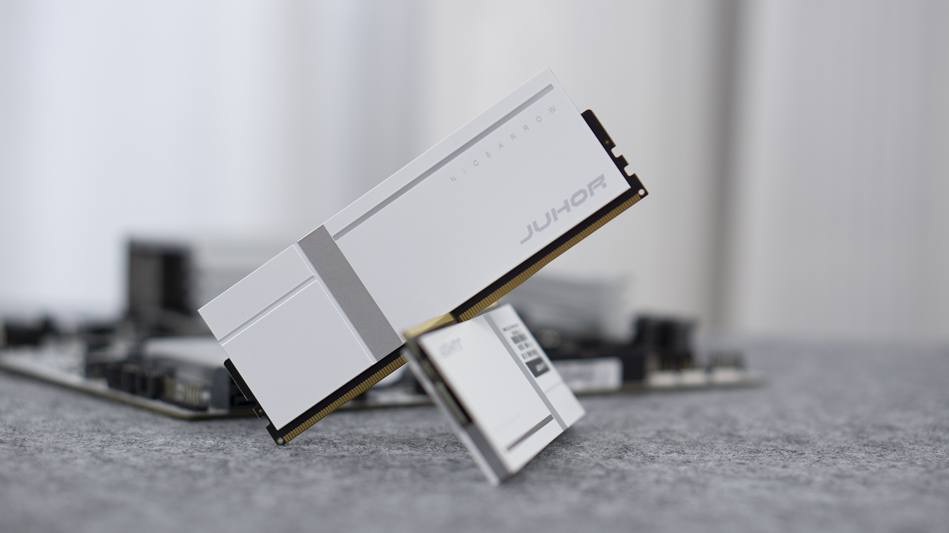 打开包装,我们就可以看到这对手感超好的内存啦。它采用了亲肤的漆面,摸上去的感觉很棒。除了右下角的JUHOR LOGO外,我们还可以看到,内存上边缘做了RGB灯条的拓展。