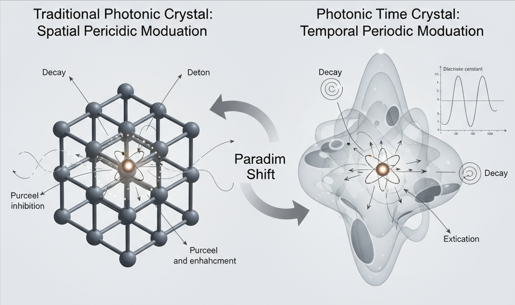 自发辐射是原子物理学的基石之一,是激发态量子发射体向低能态跃迁并释放光子的过程。传统上,控制自发辐射衰减速率的努力主要集中在空间工程上,例如利用Purcell效应的腔体结构或空间周期性的光子晶体来调控局域光子态密度。然而,随着时间维度在光子学中的引入,一个全新的研究领域——时变光子学——正在兴起,其中光子时间晶体成为了探索光与物质非平衡相互作用的理想平台。