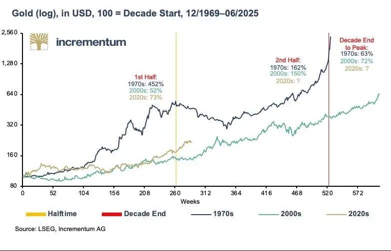2020年代前半段的发展支持了"似曾相识"的理论,即2020年代可能成为第三个黄金十年。黄金已经以所有货币计价创下众多历史新高。