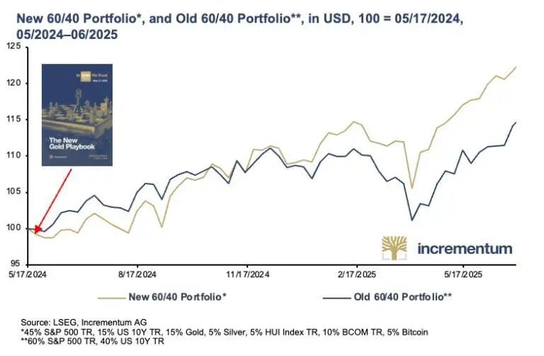 历史对比显示,如果当前周期延续类似模式,金价可能从2024年底的2624美元上升至本十年末的约6800美元。基于这一预期,包含黄金、白银、矿业股和商品的新60/40投资组合在过去12个月明显跑赢传统60/40组合。