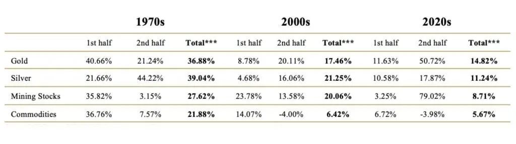 黄金矿业股被视为金价的高波动杠杆变体。1970年代前半期矿业股年涨幅超过35%,但后半期动能减弱。2000年代前半期同样表现更强,年涨幅近24%。2020年代似乎打破了这一模式:前半期表现令人失望,年均涨幅仅3.25%,但后半期迄今年化涨幅近80%,呈现强劲复苏。