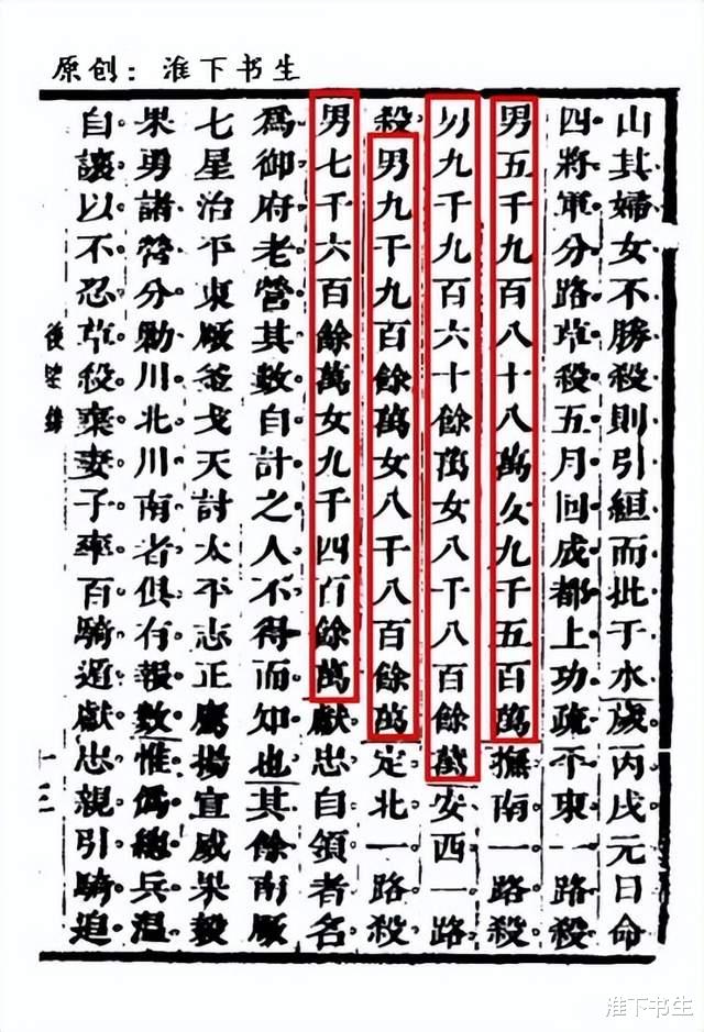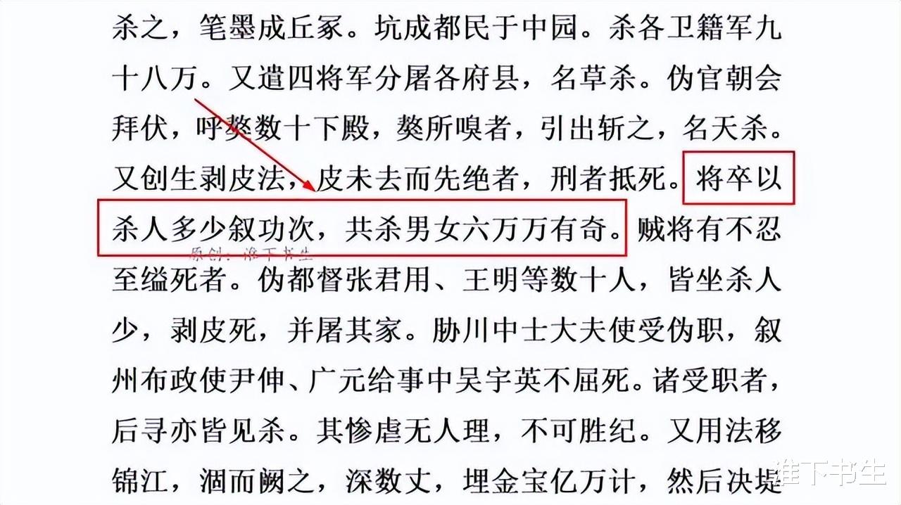 “岁丙戌元日,命四将军分路草杀。五月,回成都上功疏。平东一路,杀男五千九百八十八万,女九千五百万;抚南一路杀男九千九百六十余万,女八千八百余万;安西一路杀男九千九百余万,女八千八百余万;定北一路,杀男七千六百余万,女九千四百余万。”