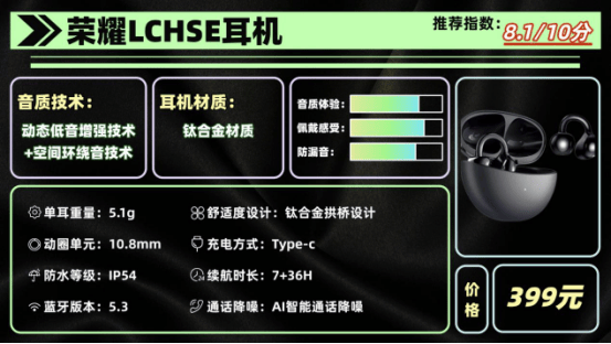 荣耀LCHSE外观轻巧简洁,整体设计偏向实用,开放式耳夹结构佩戴舒适,不塞入耳道,长时间使用也几乎没有负担。耳夹贴合耳廓,夹力适中,无论通勤、上班还是轻度运动,都能稳稳固定在耳朵上,不易滑落,同时减少耳部压迫感,佩戴体验非常友好。