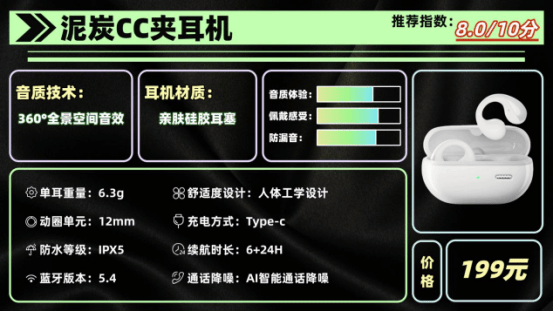泥炭CC夹整体设计简单实用,机身轻巧,佩戴感舒适,适合日常短时听歌或通勤使用。耳夹结构稳固,即便走路或轻度活动也不易滑落,佩戴压力较小,但长时间使用可能会有轻微夹耳感,总体体验偏轻松自然。