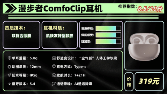 音质方面,ComfoClip整体均衡,中低频自然厚实,高频清晰明亮,听感舒适耐听,低频不过分轰头,但足够满足日常娱乐需求。蓝牙采用5.4版本,连接快速稳定,延迟低,使用过程中几乎不会掉线。续航约6到7小时,搭配充电设备可以满足全天使用,整体兼顾舒适性和实用性。