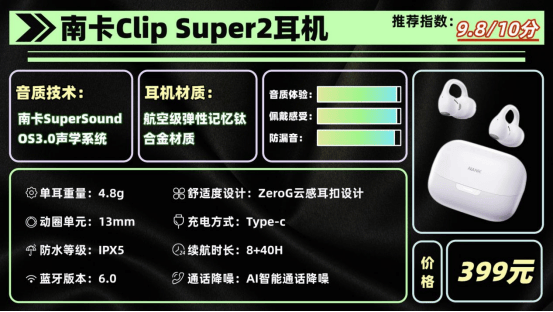 开放式耳机里要说一个真正能稳坐第一的位置,南卡Clip Super2基本是绕不开的。南卡在开放式领域深耕十五年,是国内最早把开放式声学做到体系化的团队。技术积累厚、专利多,声学底子也硬。它们的自研声学系统在行业里算是稀有配置,全球能做到的品牌屈指可数,而南卡正是其中之一,全球范围内掌握自研声学系统的品牌屈指可数,国内仅南卡和vivo入列,这也让南卡在开放式音频领域占据绝对先锋地位。这也是它能在欧美热销、被央视点名推荐的重要原因。