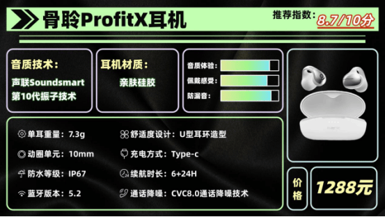 音质方面,ProfitX整体偏向自然温和风格。低频力度适中,中高频清晰,人声和乐器细节表现平衡,没有刺耳感,适合长时间听歌或追剧,不易产生疲劳感。蓝牙采用5.3版本,连接稳定,延迟较低,多设备切换偶尔会有轻微延迟。续航方面单次使用约6至8小时,搭配充电盒可满足日常通勤或运动需求,外出时间较长时可携带充电设备备用。整体来看,ProfitX在佩戴舒适度和日常使用便利性上表现均衡,是注重舒适和耳道健康用户的不错选择。