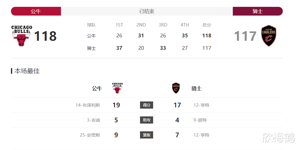 比赛进程跌宕起伏,首节骑士就展现出强劲的进攻火力,单节轰下37分,而公牛仅得到26分,骑士带着11分的优势进入第二节。不过第二节风云突变,公牛找回状态拿到31分,骑士则手感下滑只得到20分,公牛成功将分差缩小至平局。第三节双方你来我往,公牛26分,骑士33分,骑士重新取得7分领先。关键的第四节,公牛发起绝地反击,单节砍下35分,骑士得到27分,公牛凭借第四节的出色发挥,最终实现逆转,以1分险胜。